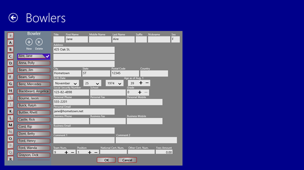 On this screen you can view or change the bowler records. To completely remove a bowler from you data base, select the bowler and click the Delete button.