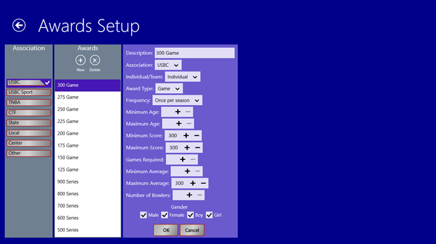 BowlSec can detect when a bowler earns many types of awards. The application has many standard awards predefined. This function allow you to add or change awards that the application will watch for.