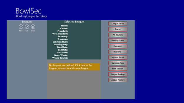 The first time you run the application, the data base is empty. To create a league click New in the league column and give the league a name.
