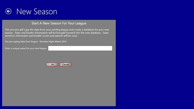 The new season function will copy the data from a league to a new database and prepare the league for a new bowling season. Team and bowler information will be brought forward. Team won/loss information and bowler scores and awards will be reset. To go to the new season function click the New Season Button on the main screen and the new season screen will appear.