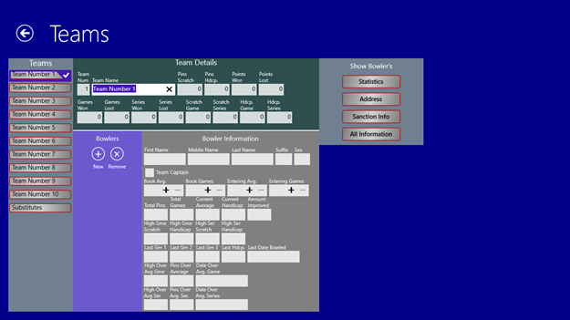 To add a bowler to the team, click the New button in the Bowlers column. Enter the bowler's name and other data, if the bowler is already in your data base his or her information will be automatically filled in after you enter their name.