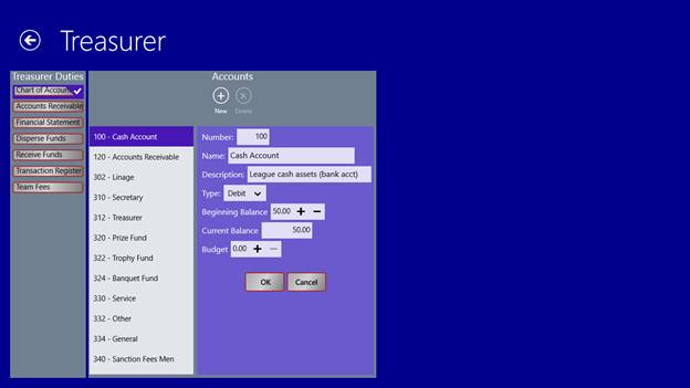 Accounts are where your league's financial transactions are recorded. When you run the League Setup function, an initial Chart of Accounts is created. There are three types of accounts: Asset (i.e. Cash), Revenue (the money due to the league), and Expense (the money the league pays out). You can add other accounts if you need to, and you delete accounts that you do not need. NOTE: Some accounts are necessary for the application to run properly, and cannot be deleted. The accounts numbers are all three digits long. Asset accounts start with a 1, Revenue accounts start with a 3, and Expense accounts start with a 5.