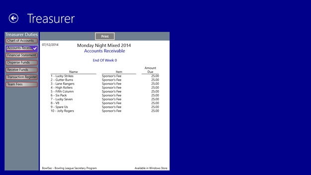 Printing the bowler payment history is an optional feature in the application, and after your 30 day trial period, this printing will be disabled unless you purchase a license for the full version of the application. This feature is fully functional during the trial period so you can explore and become familiar will the functionality this feature provides.