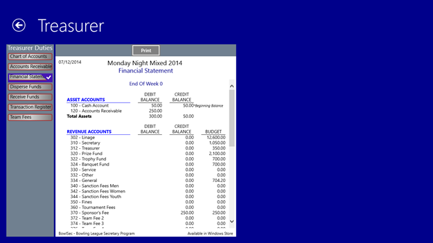 The financial statement gives you a report of you various accounts. It shows how much money should be in your cash account, how much money is in you accounts receivable account, how much revenue the league has earned, and how much money the league has spent. In addition, this report is used by the league president for his or her monthly verification of funds.