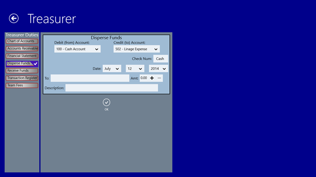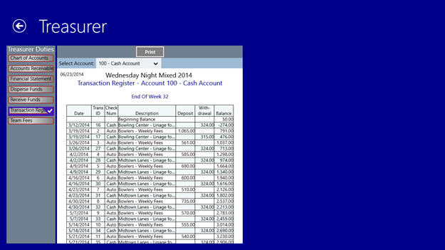 The treasurer's duties are mostly financial. This section of the application is designed to handle most of these responsibilities. It tracks payments and expenditures, shows an estimated budget, provides financial statements, provides transaction registers, and several other functions.