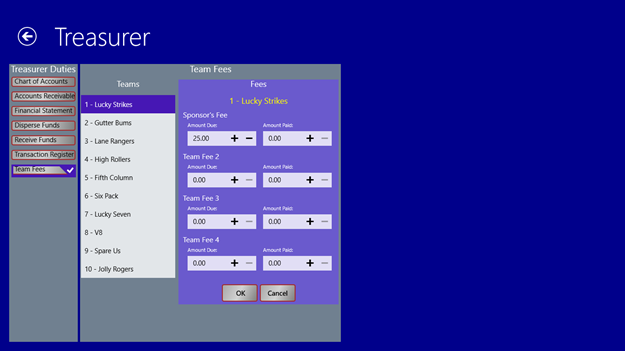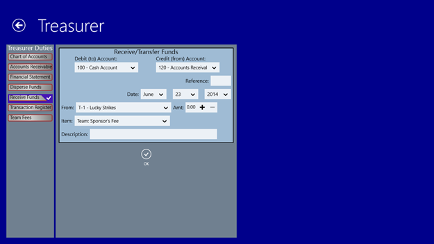 Click on the Treasurer Button on the main screen and the treasurer's functions will be displayed.