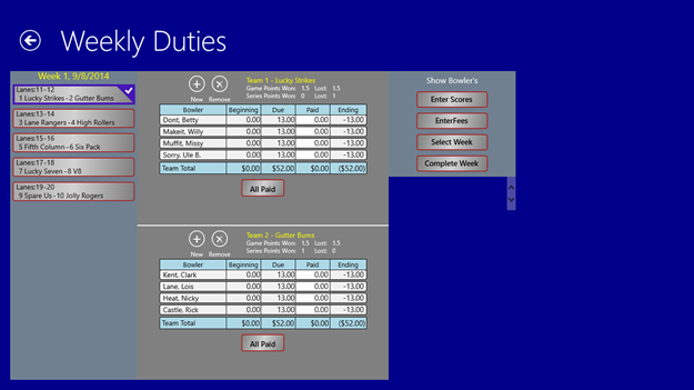 The amount due will be calculated for each bowler that has one or more scores entered. You can enter the amount paid for each bowler, or if all bowlers on the team paid the amount due you can click the All Paid button for that team and the amounts will be automatically filled in.