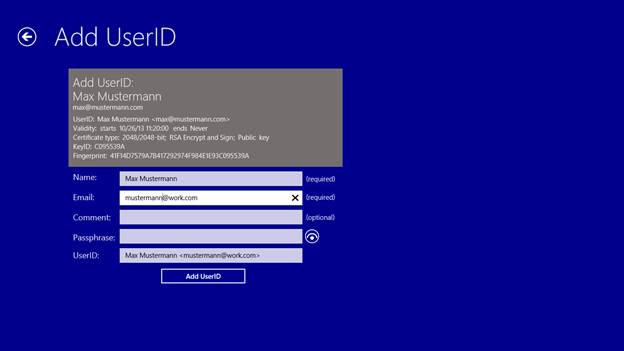 Enter the new data (name, e-mail address, etc.), enter your pass phrase and click the Add UserID button. The userID will be added to the key.