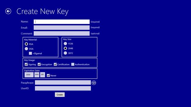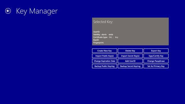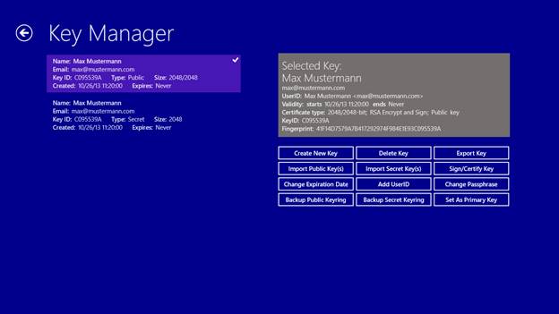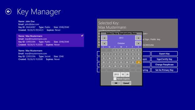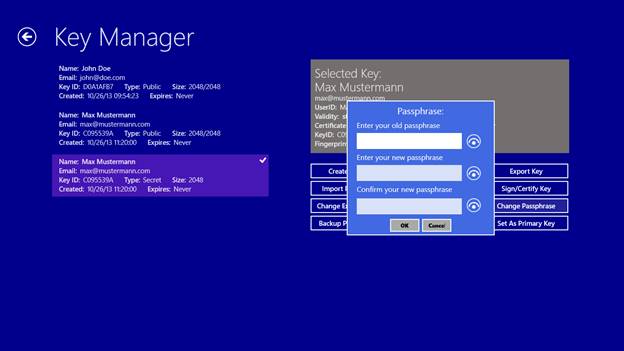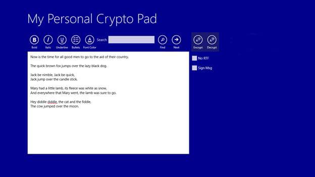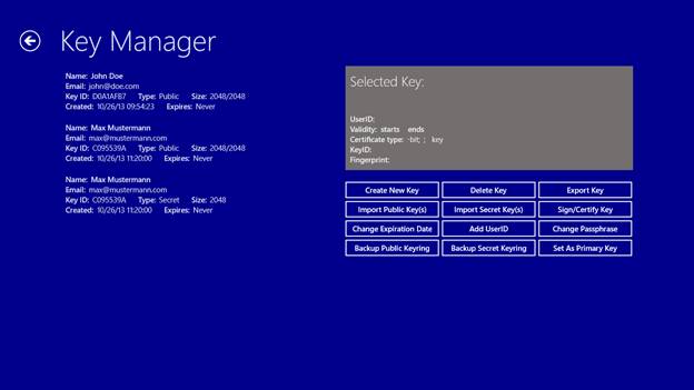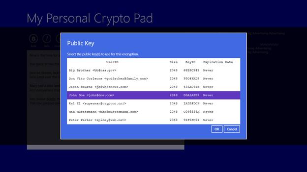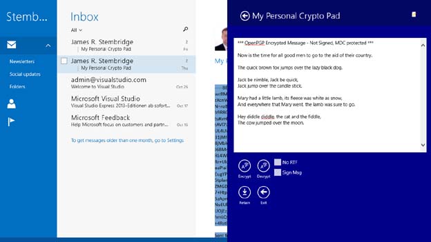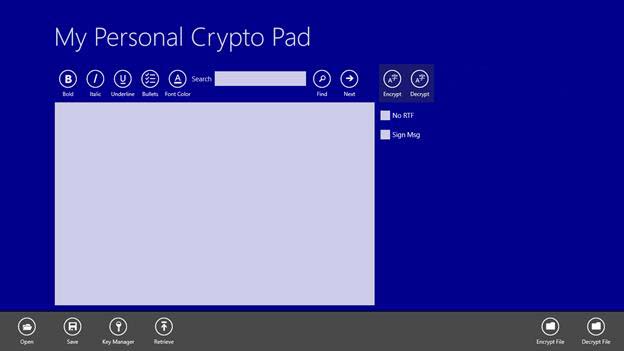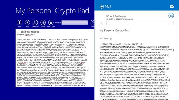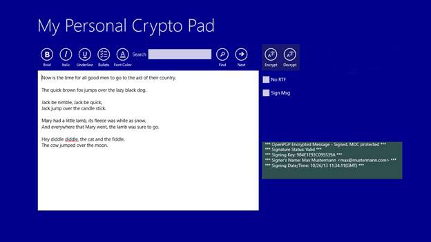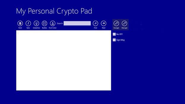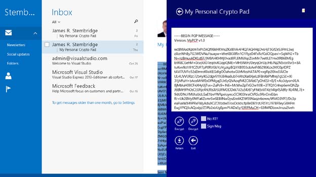 My Personal Crypto Pad is an implementation of the OpenPGP standard as defined by RFC4880 . It enables users to secure emails and files with the help of encryption and digital signatures. Encryption protects the contents against an unwanted party reading it. Digital signatures make sure that it was not modified and comes from a specific sender. In addition, it features a key management system to store and manage your public and secret keys. My Personal Crypto Pad interfaces with Windows 8 Mail (utilizing share charms), and can be used with other mail programs (i.e. Gmail, Hotmail, etc.) as well.
