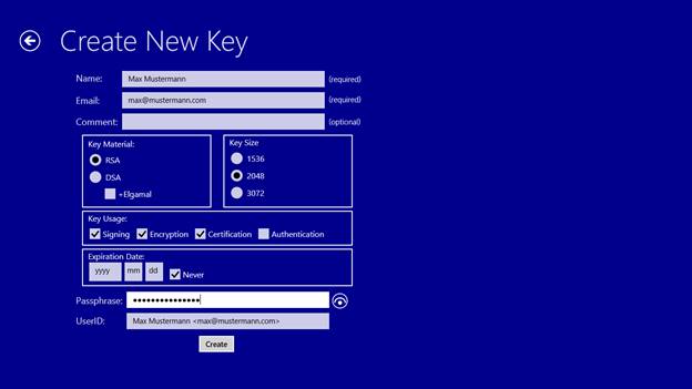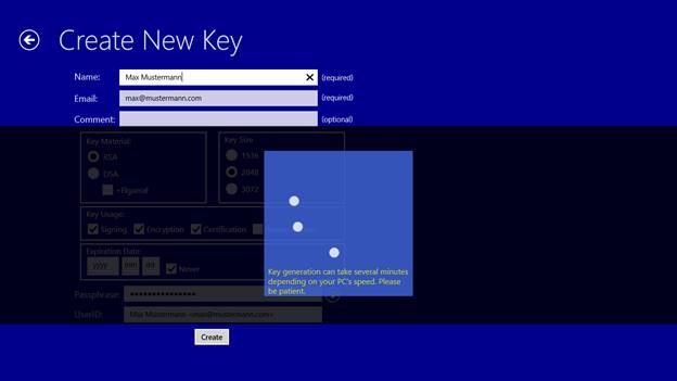 Click the Create button to generate the keys. You will be prompted to confirm your pass phrase, and then the key pair will be generated.