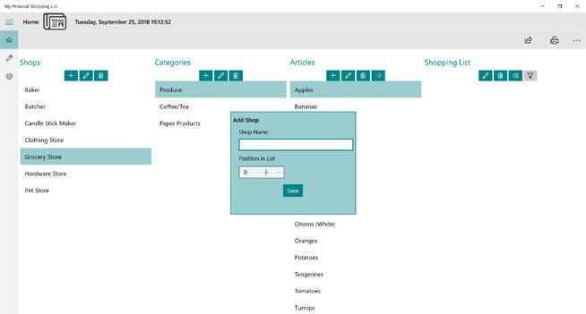 To add a new shop click the New button at the top of the Shops column. A window will open, and you can enter the name of the new shop. The position in list field tells the application where in the display list you want the shop to appear. This allows you to organize your shops in the order you choose. If you want to change the order of the Shops list, you can either edit the Shops entries and change the position number, or you can click and drag a shop to a new position in the list.