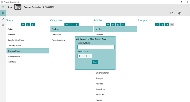 The display is divided into four columns. The three columns on the left are for the master shopping list data. They show the shops where you buy things, the categories (or aisles) within the shops, and the articles found in the categories. The column on the right is the current shopping list. It show the items you wish to purchase from the various shops.