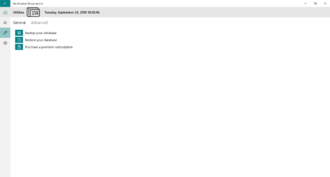 The Utilites screen allows you to perform certain functions concerning My Personal Shopping List. You can backup your data base, which we recommend you do after making changes to your master shopping list. You can restore your data base from a backup should something happen on your PC and your shopping list data is load, and you can purchase a premium subscription for My Personal Shopping List.