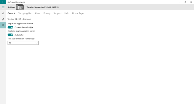 OneDrive synchronization option: This feature only applies the the premium version of My Personal Shopping List. With the premium version, you can share your shopping list with multiple Windows devices. For example, your PC, your tablet, and your Windows phone. Data sharing can be done two different ways: Manually, where you click a button on the Home Screen whenever you wish to share your data, or Automatically, where the application will check OneDrive for a new version of the data when the application starts or resumes and download it, and it will upload your data to OneDrive when you exit the application the application suspends.