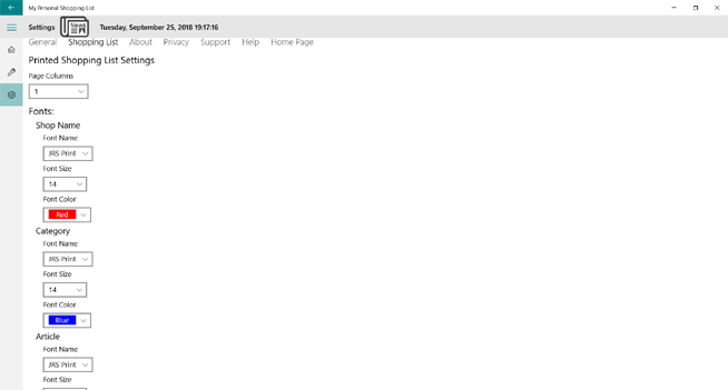 Printed Shopping List Settings allow you to tell the application how many columns you wish the printed page to have when you print your shopping list. You can choose between in the range between one and four. In addition, you can control the font name, font color, and font size to be used when printing a shopping list. You can specify different settings for the shops, categories, and articles.